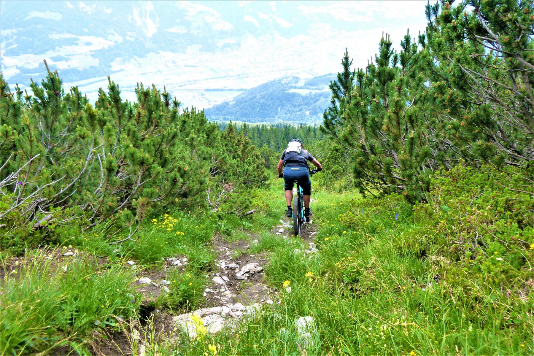 Im unteren Teil zeigt sich der Trail von seiner versöhnlicheren Seite. Über Maria Tax hinunter nach Stans wird der Weg breiter, runder und flüssiger – technisch bleibt’s mit S3/G2 spannend, aber deutlich entspannter.