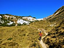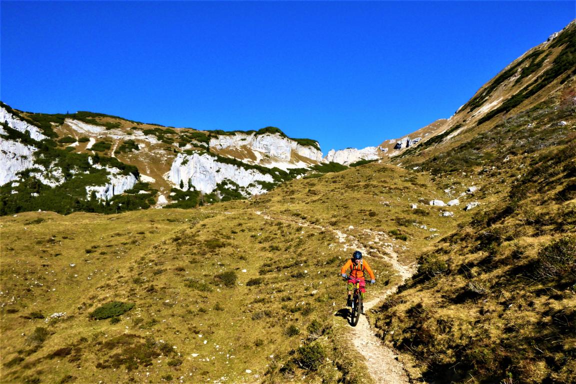 Vom Steinernen Tor führt der etwas technische Trail im Schwierigkeitsgrad S2 mit ein paar S3 Stellen hinunter zur Dalfazalm. Die Abfahrt von der Alm führt anfangs im Schwierigkeitsgrad S1 mit leichten Spitzkehren und dann über einzelne S3 Stellen sehr technisch hinunter zum Achensee.