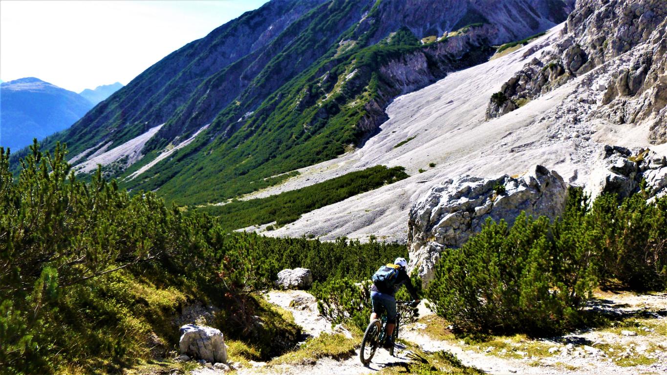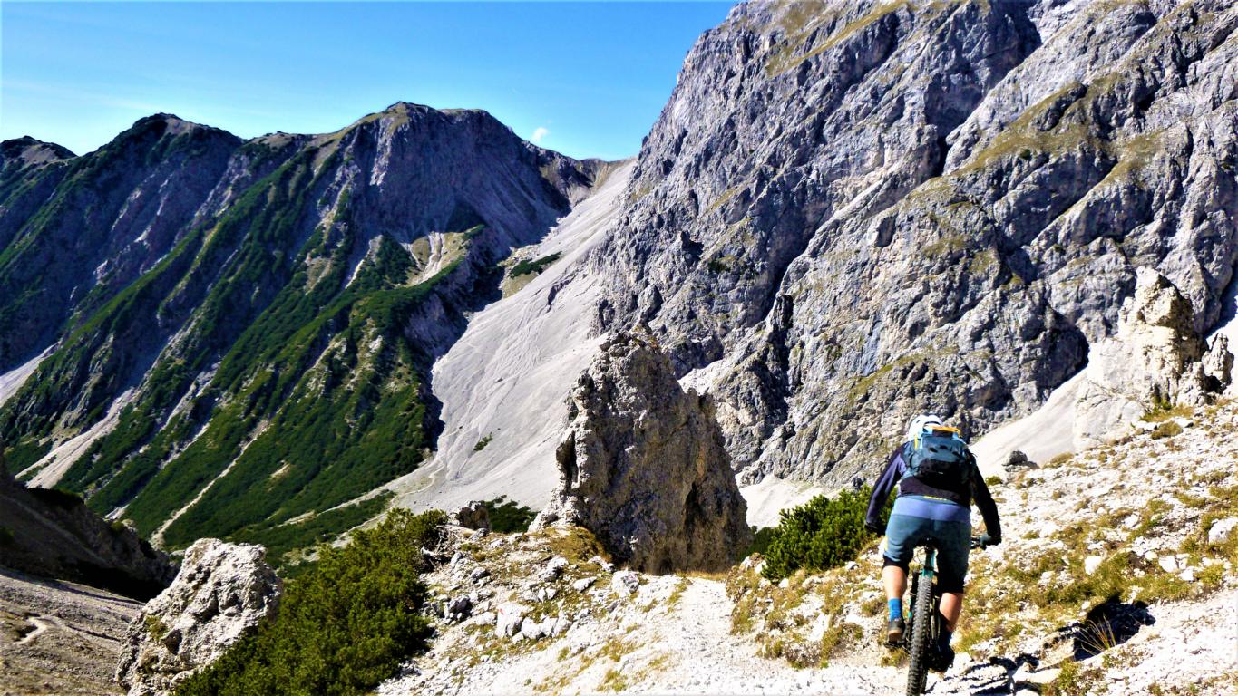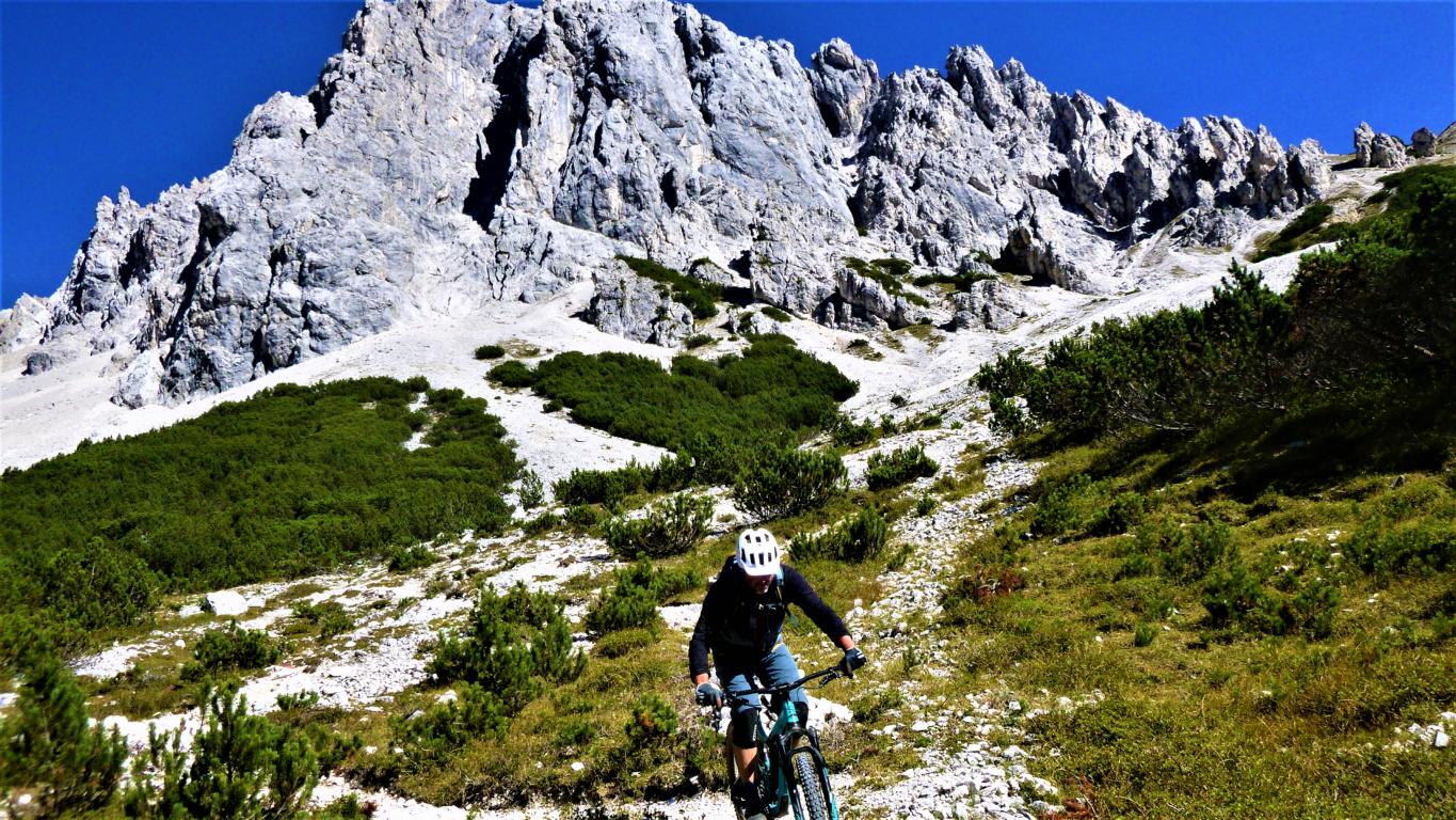 Der Trail vom Törl führt auf grobsteinigem Untergrund mit vielen engen Spitzkehren, ca. 45 Stk. hinunter zur Hölle. Die Kehren sind sehr eng auf losem Schotter, das Hinterrad versetzen ist zwingend und deshalb mit S3 zu bewerten. Weiter gehts das Tal entlang hinaus im Schwierigkeitsgrad S2 mit ein paar S3 Stellen über das Lehnberghaus hinunter zum Arzkasten.