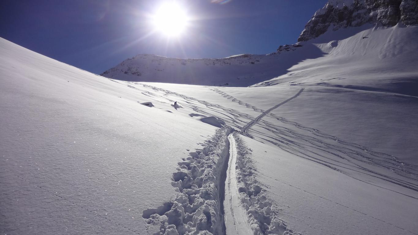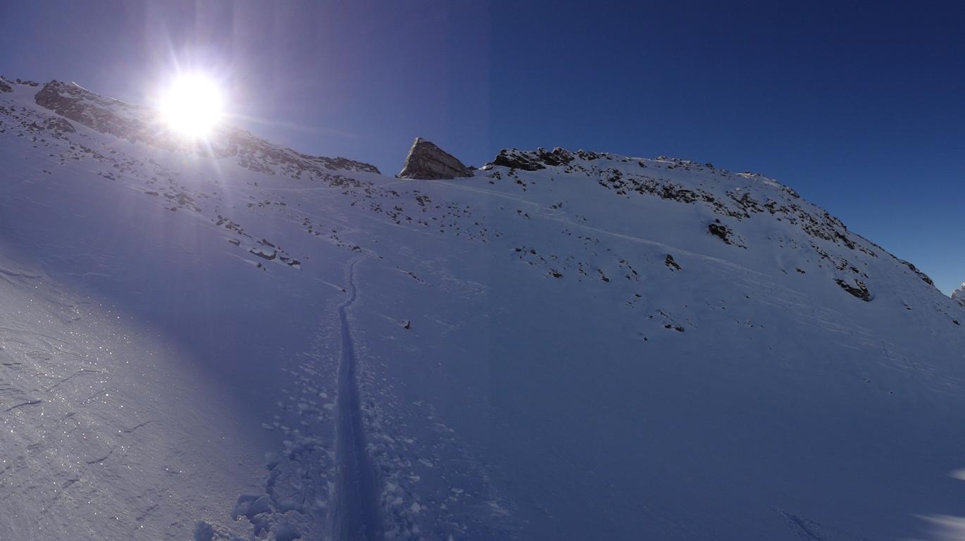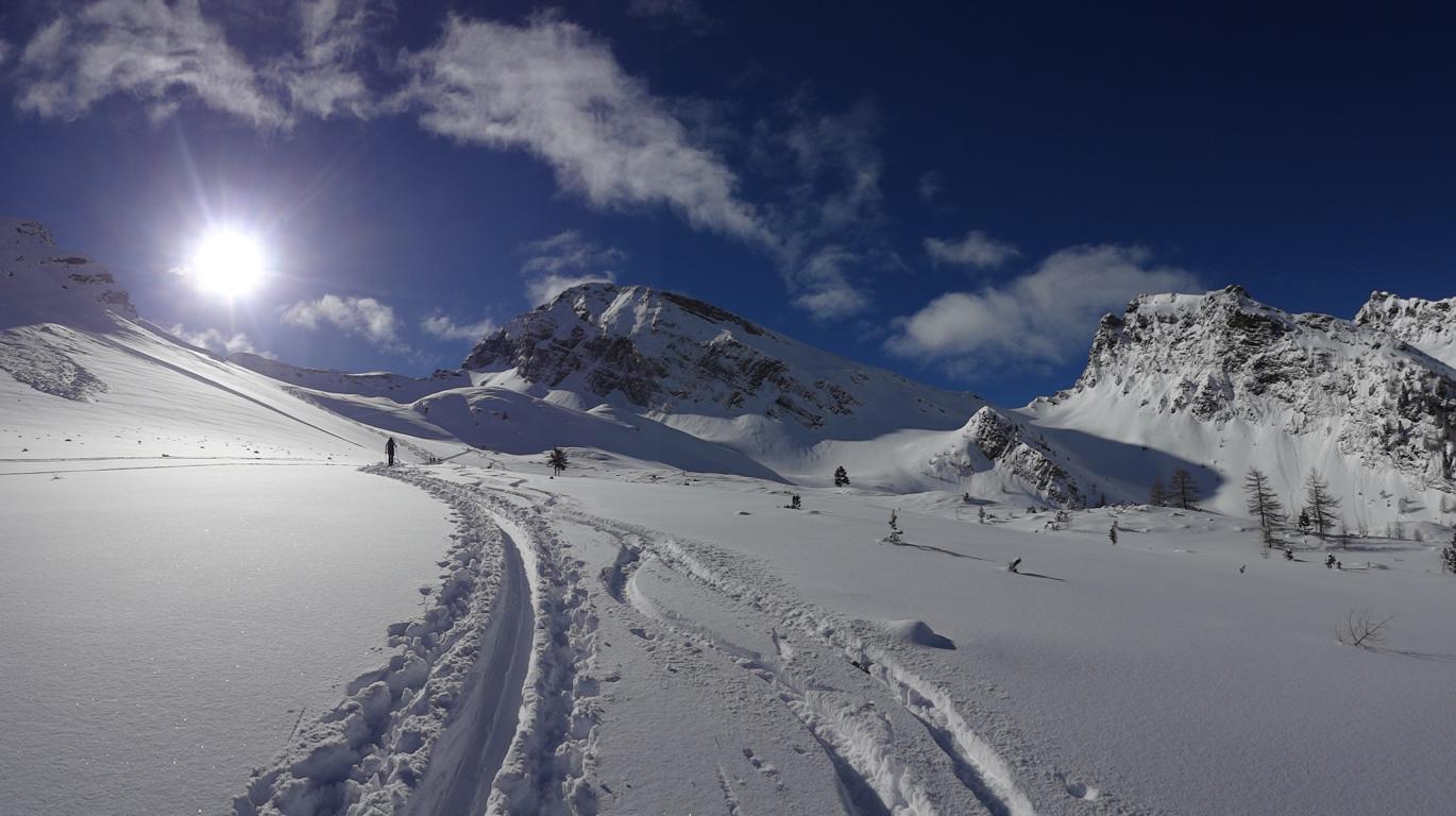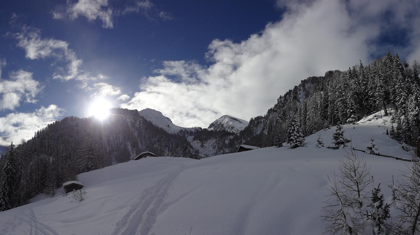 Heute sind Hilde, Martin und ich ins Valsertal gefahren und von Vals Richtung Sumpfschartl aufgestiegen. Unten hatte es ca.15 cm Neuschnee. Von den Almhütten in Innervals über die Brücke auf die andere Bachseite. Über eine Wiese erreicht man einen Kahlschlag, über diesen hinauf zur Forststraße und links weiter zur Bloaderalm. Von der Alm auf den dahinter liegenden Wasserfall zu und links vom Wasserfall über eine Steilstufe und weiter in dem engeren Tal bis man oben links in den weiten Kessel gelangt. Von dort bis zum steilen Schlusshang gerade zum Schartl (2666 m) hinauf. Während Hilde und Martin noch aufs Schartl aufstiegen fuhr ich von Dort ca. 400 Hm ab und fällte die Skier wieder auf und ging auf die links befindliche Scharte der Saxalmwand und weiter auf den Höchsten Punkt (2730 m) des Grates. Diese Abfahrtskombination lohnte sich sehr. Der Hang von der Scharte war mit perfekten Pulver ohne Windeinfluss einfach der Traum schlechthin.