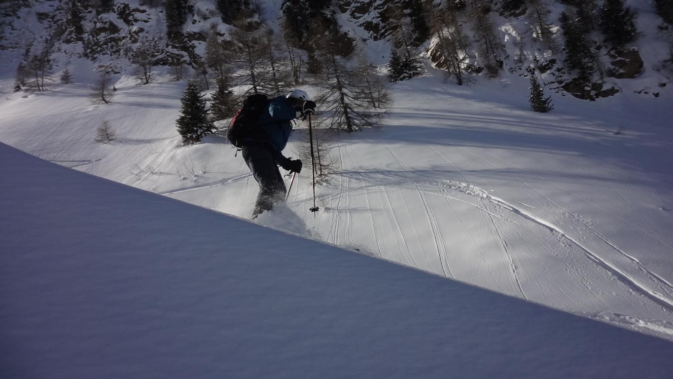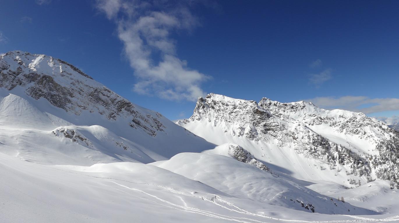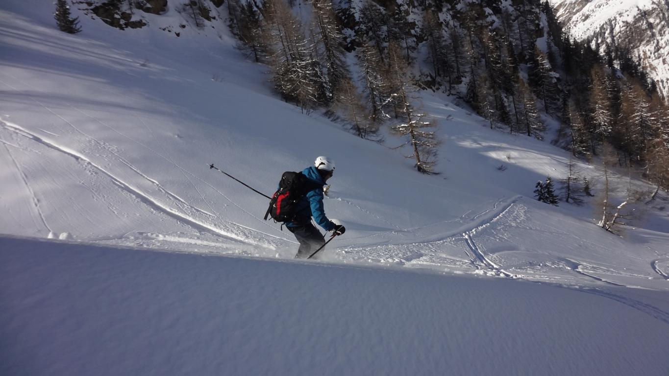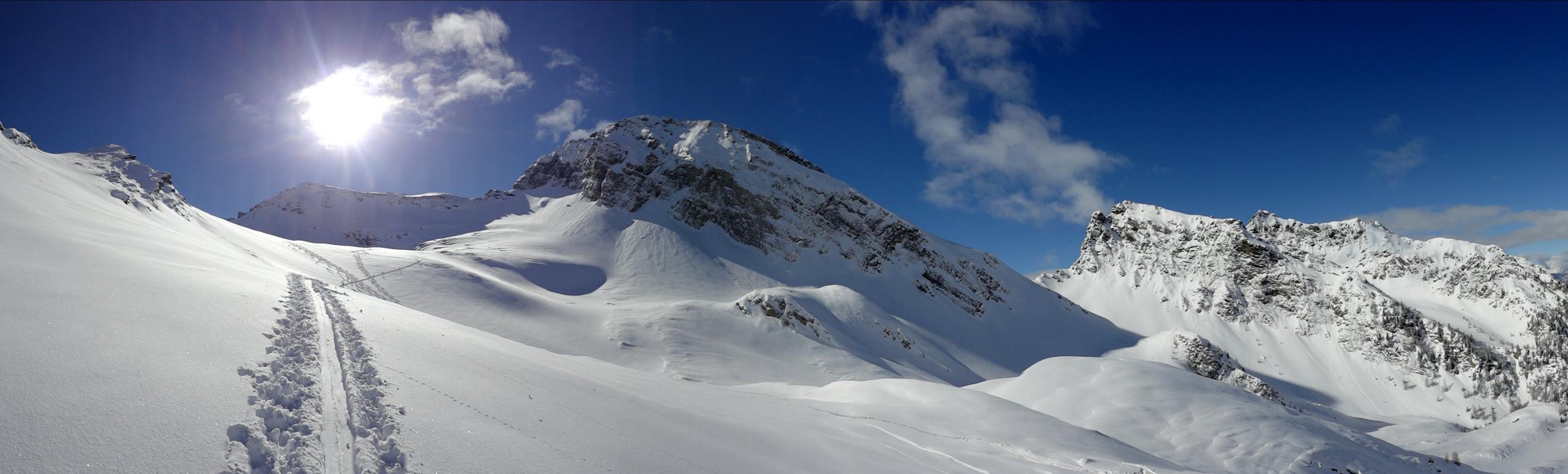 Heute sind Hilde, Martin und ich ins Valsertal gefahren und von Vals Richtung Sumpfschartl aufgestiegen. Unten hatte es ca.15 cm Neuschnee. Von den Almhütten in Innervals über die Brücke auf die andere Bachseite. Über eine Wiese erreicht man einen Kahlschlag, über diesen hinauf zur Forststraße und links weiter zur Bloaderalm. Von der Alm auf den dahinter liegenden Wasserfall zu und links vom Wasserfall über eine Steilstufe und weiter in dem engeren Tal bis man oben links in den weiten Kessel gelangt. Von dort bis zum steilen Schlusshang gerade zum Schartl (2666 m) hinauf. Während Hilde und Martin noch aufs Schartl aufstiegen fuhr ich von Dort ca. 400 Hm ab und fällte die Skier wieder auf und ging auf die links befindliche Scharte der Saxalmwand und weiter auf den Höchsten Punkt (2730 m) des Grates. Diese Abfahrtskombination lohnte sich sehr. Der Hang von der Scharte war mit perfekten Pulver ohne Windeinfluss einfach der Traum schlechthin.