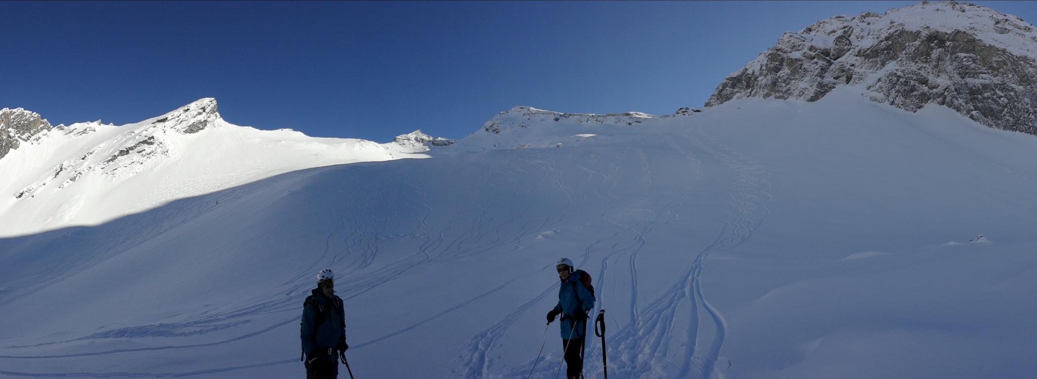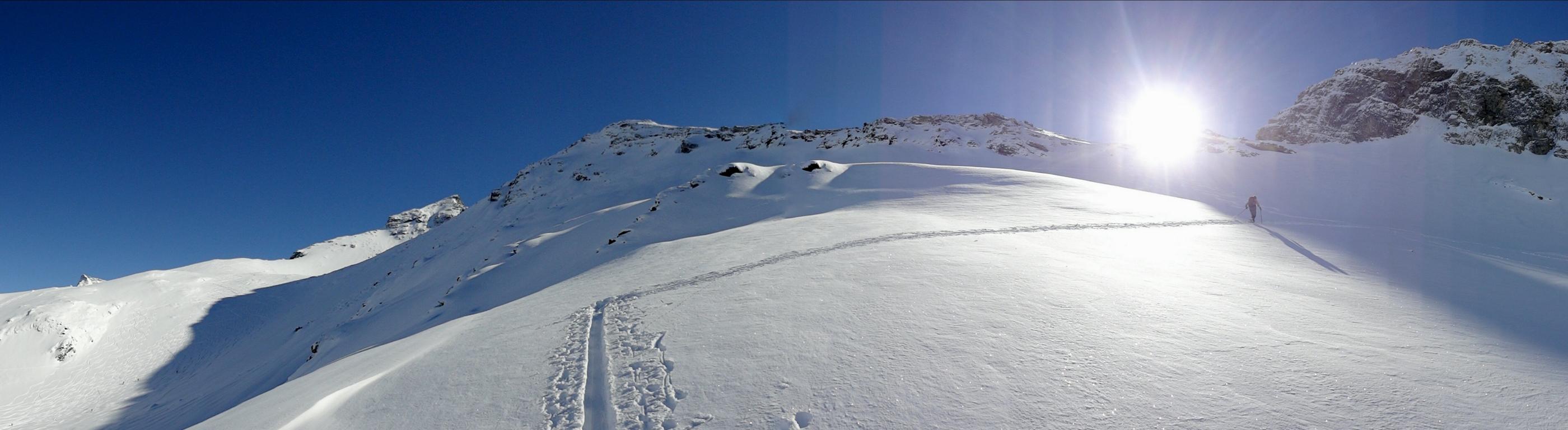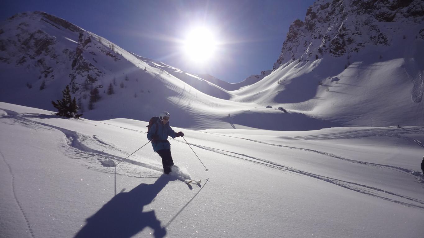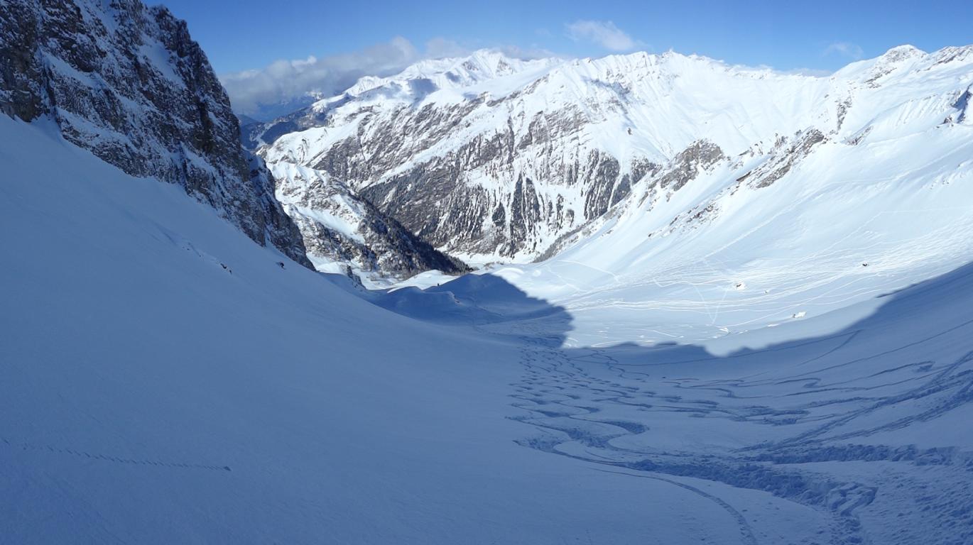 Heute sind Hilde, Martin und ich ins Valsertal gefahren und von Vals Richtung Sumpfschartl aufgestiegen. Unten hatte es ca.15 cm Neuschnee. Von den Almhütten in Innervals über die Brücke auf die andere Bachseite. Über eine Wiese erreicht man einen Kahlschlag, über diesen hinauf zur Forststraße und links weiter zur Bloaderalm. Von der Alm auf den dahinter liegenden Wasserfall zu und links vom Wasserfall über eine Steilstufe und weiter in dem engeren Tal bis man oben links in den weiten Kessel gelangt. Von dort bis zum steilen Schlusshang gerade zum Schartl (2666 m) hinauf. Während Hilde und Martin noch aufs Schartl aufstiegen fuhr ich von Dort ca. 400 Hm ab und fällte die Skier wieder auf und ging auf die links befindliche Scharte der Saxalmwand und weiter auf den Höchsten Punkt (2730 m) des Grates. Diese Abfahrtskombination lohnte sich sehr. Der Hang von der Scharte war mit perfekten Pulver ohne Windeinfluss einfach der Traum schlechthin.