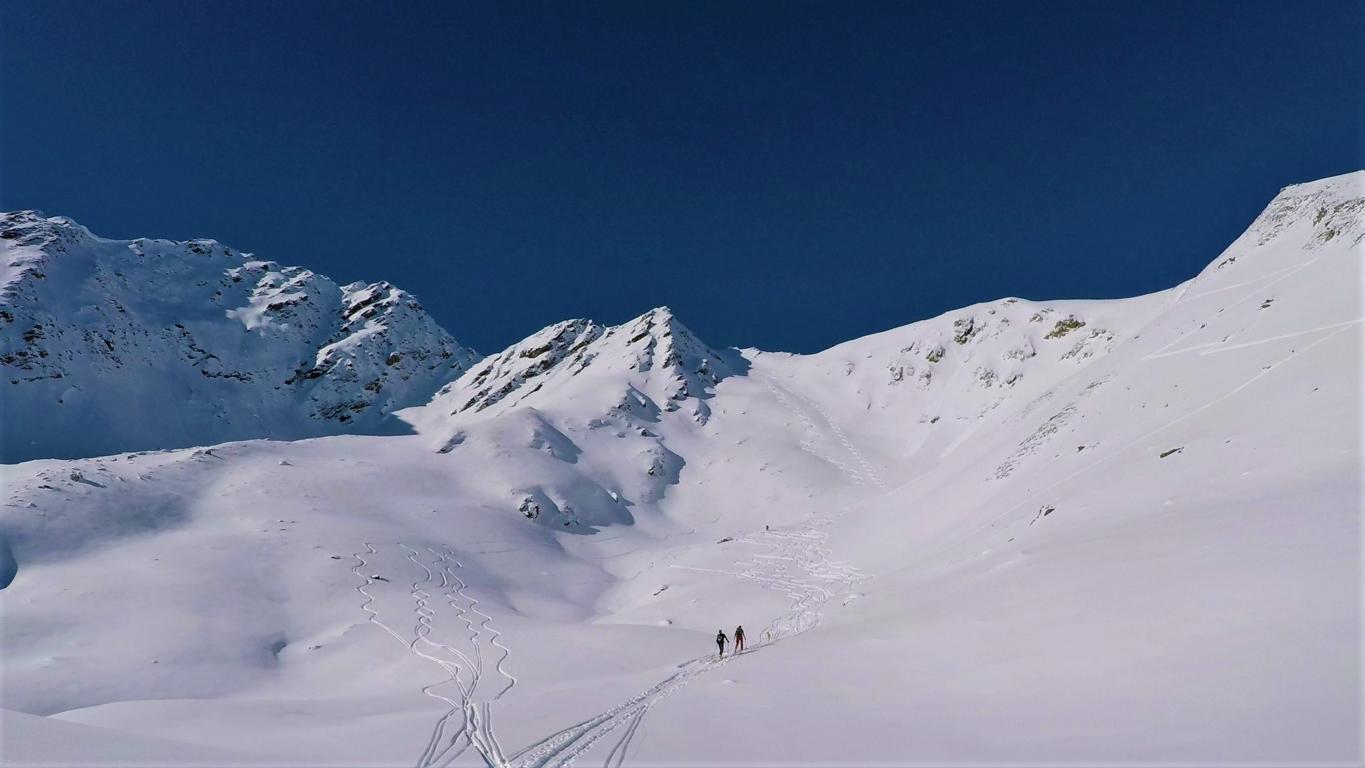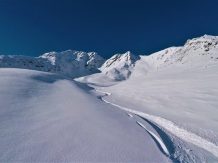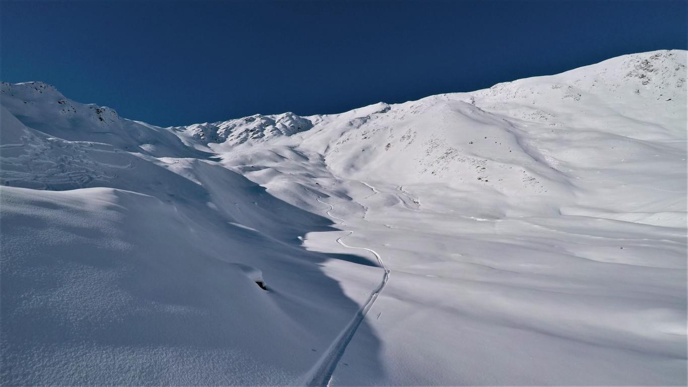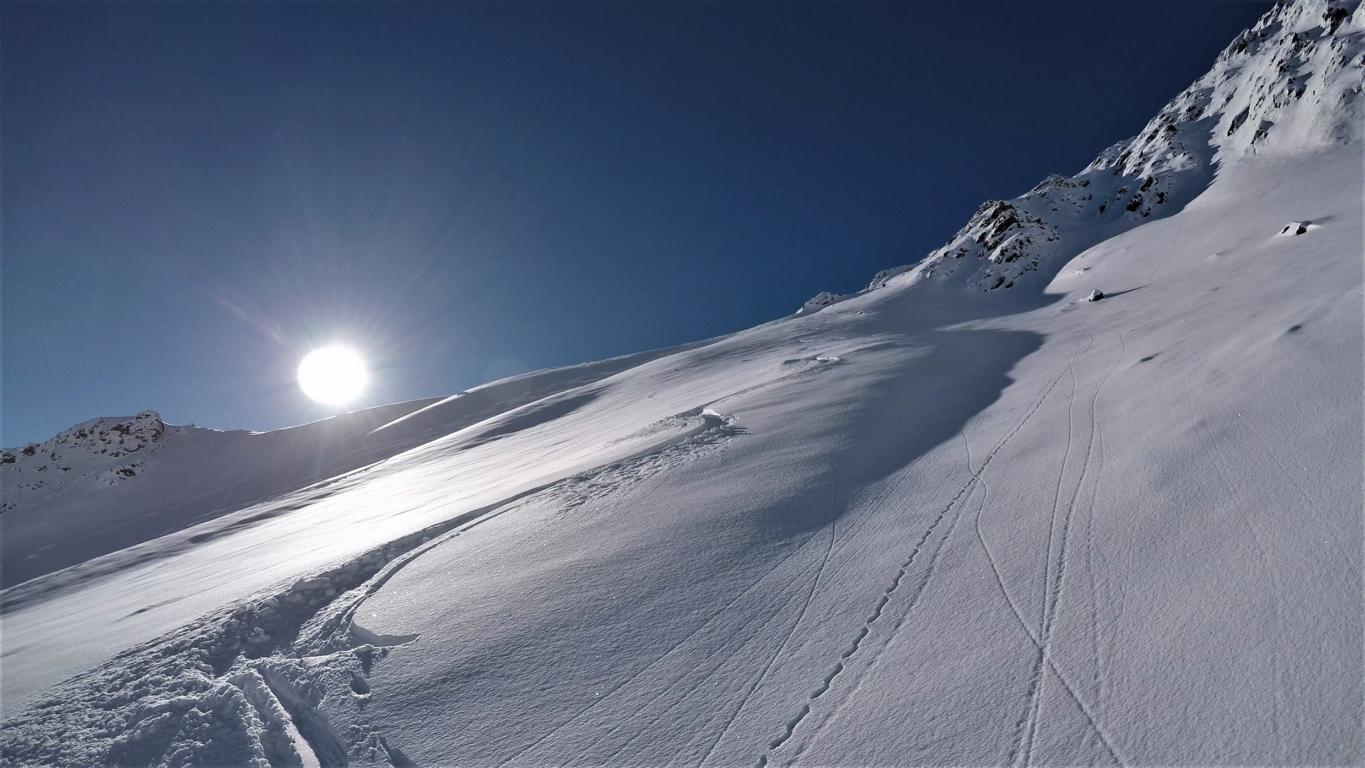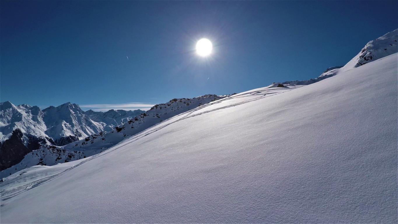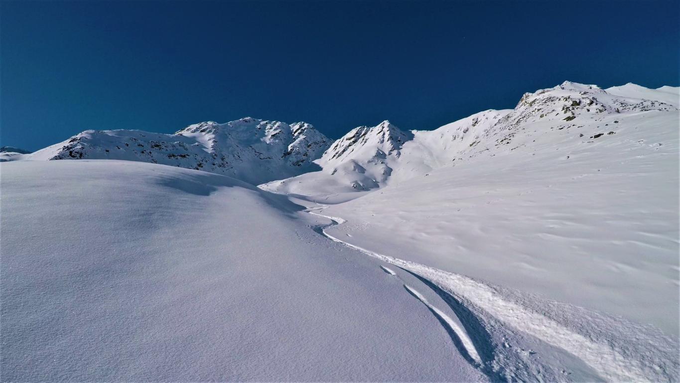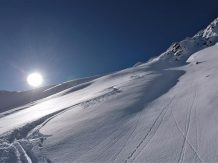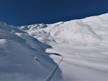 Abfahrt von der Scharte bei guten bis sehr guten Pulver, ca. 25 cm Neuschnee, über die Praxmarer Alm hinunter. Die Unterlage ist ausreichend aber mit Steinkontakt ist doch noch zu rechnen!