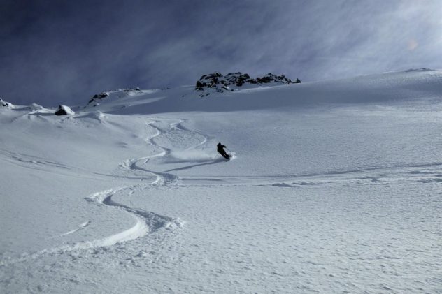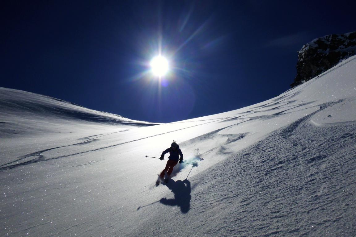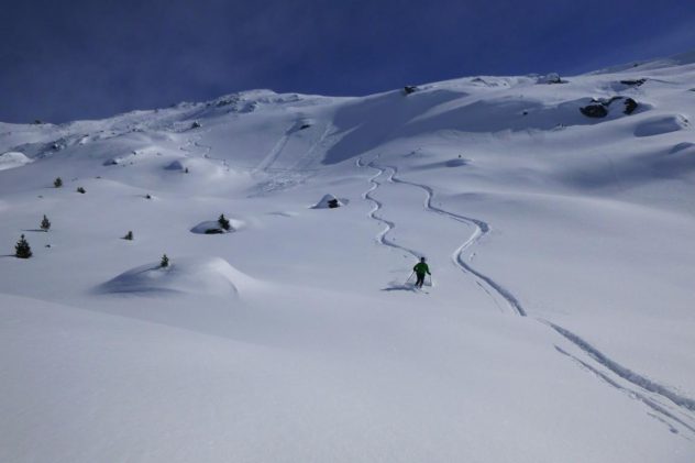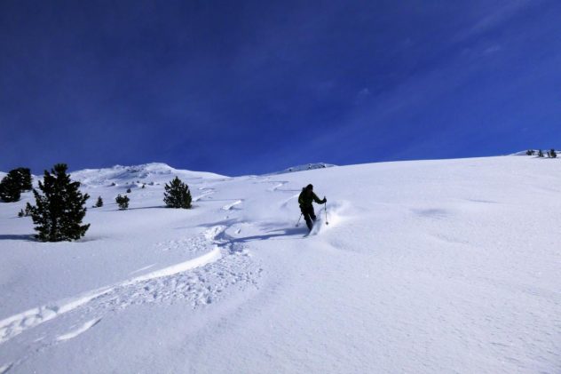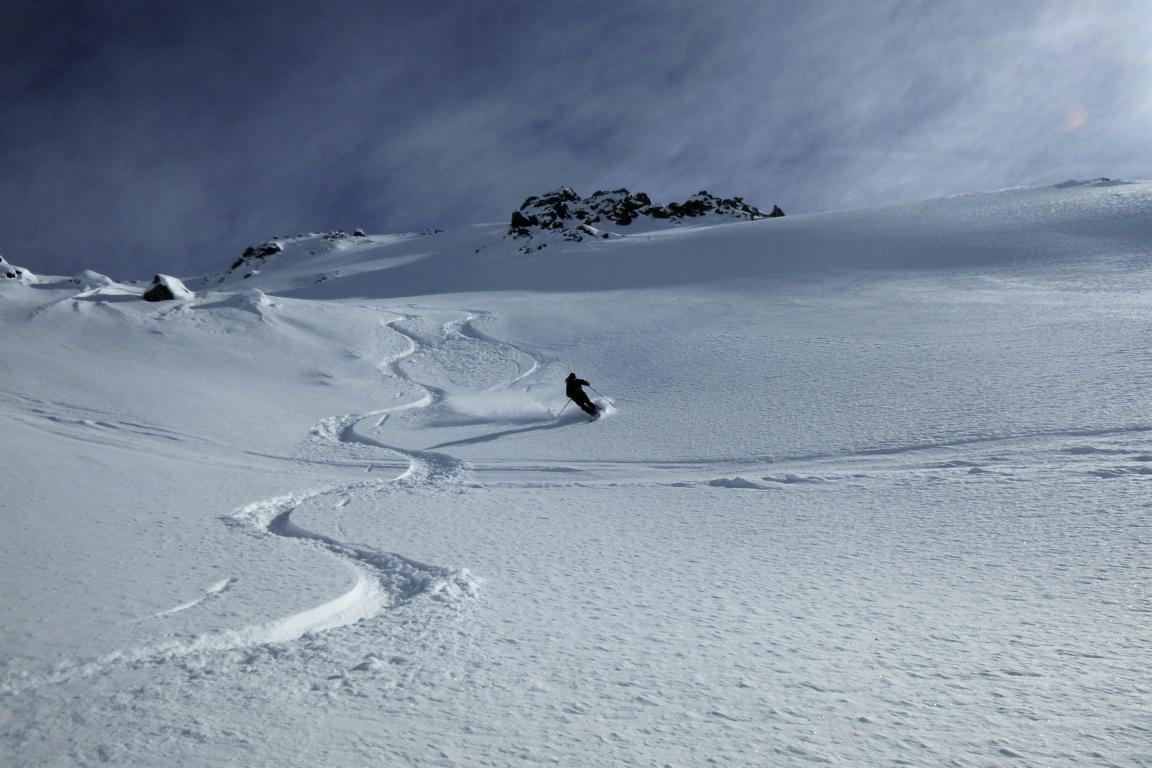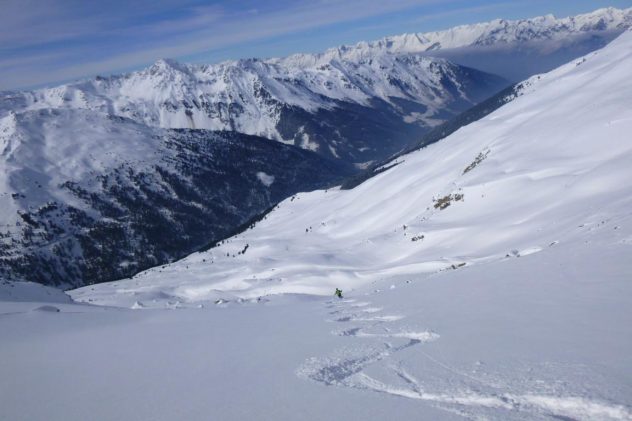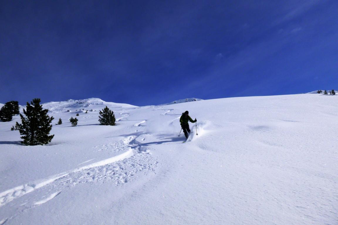 Abfahrt nordseitig über die steileren Hänge direkt vom Gipfel hinab in die weiten Mulden bei bestem Pulver bis zum Lizumerbach.