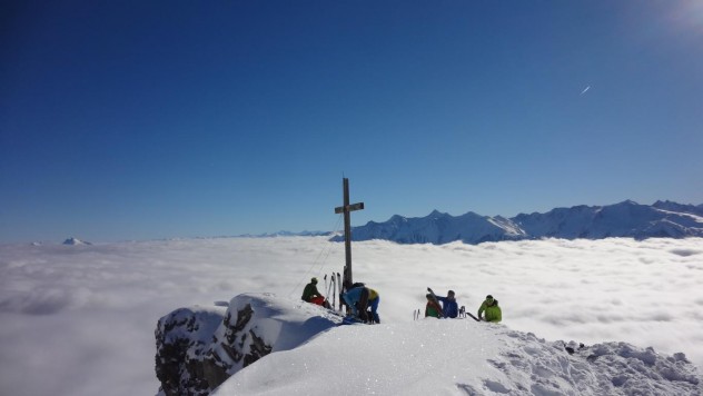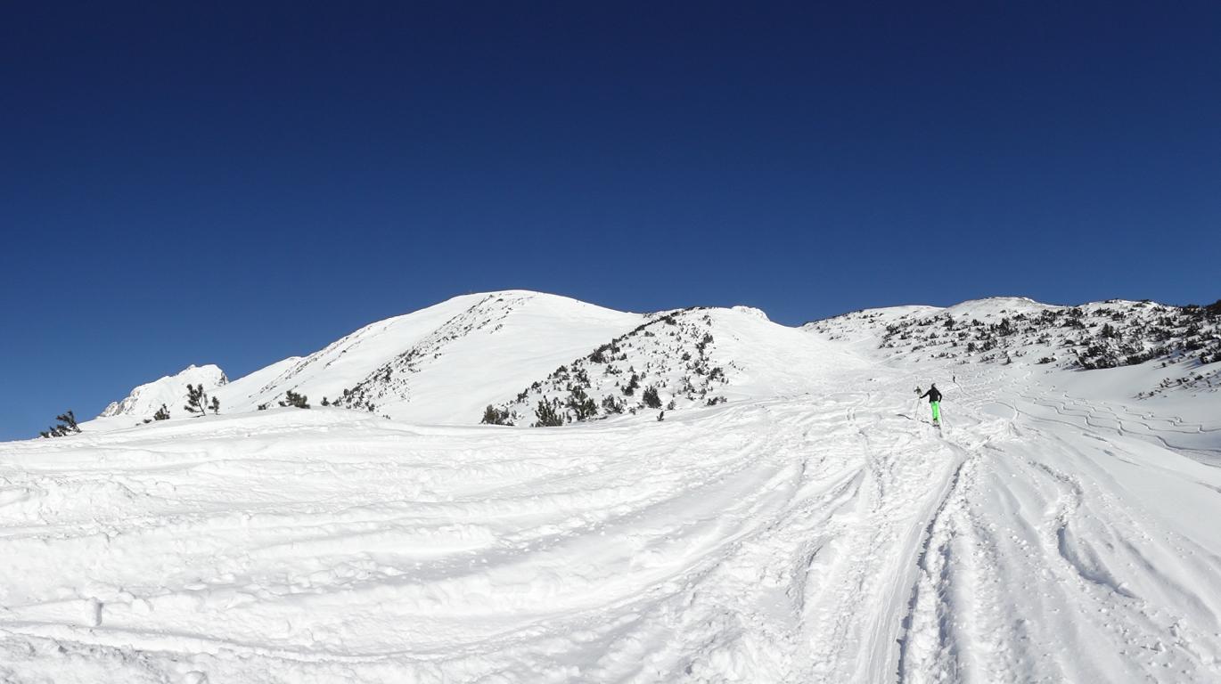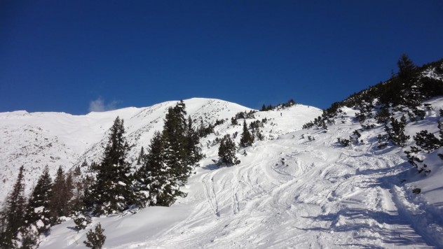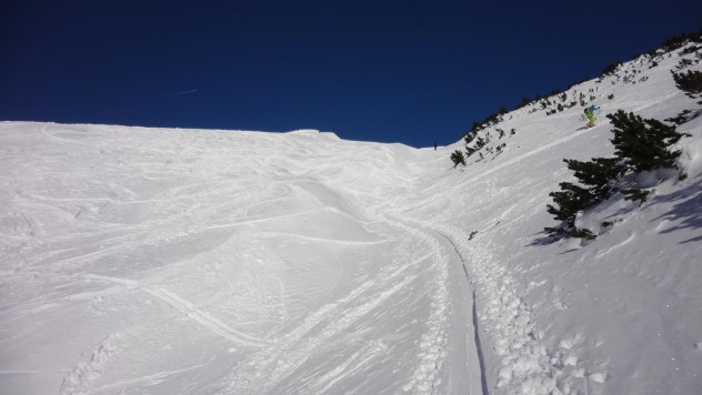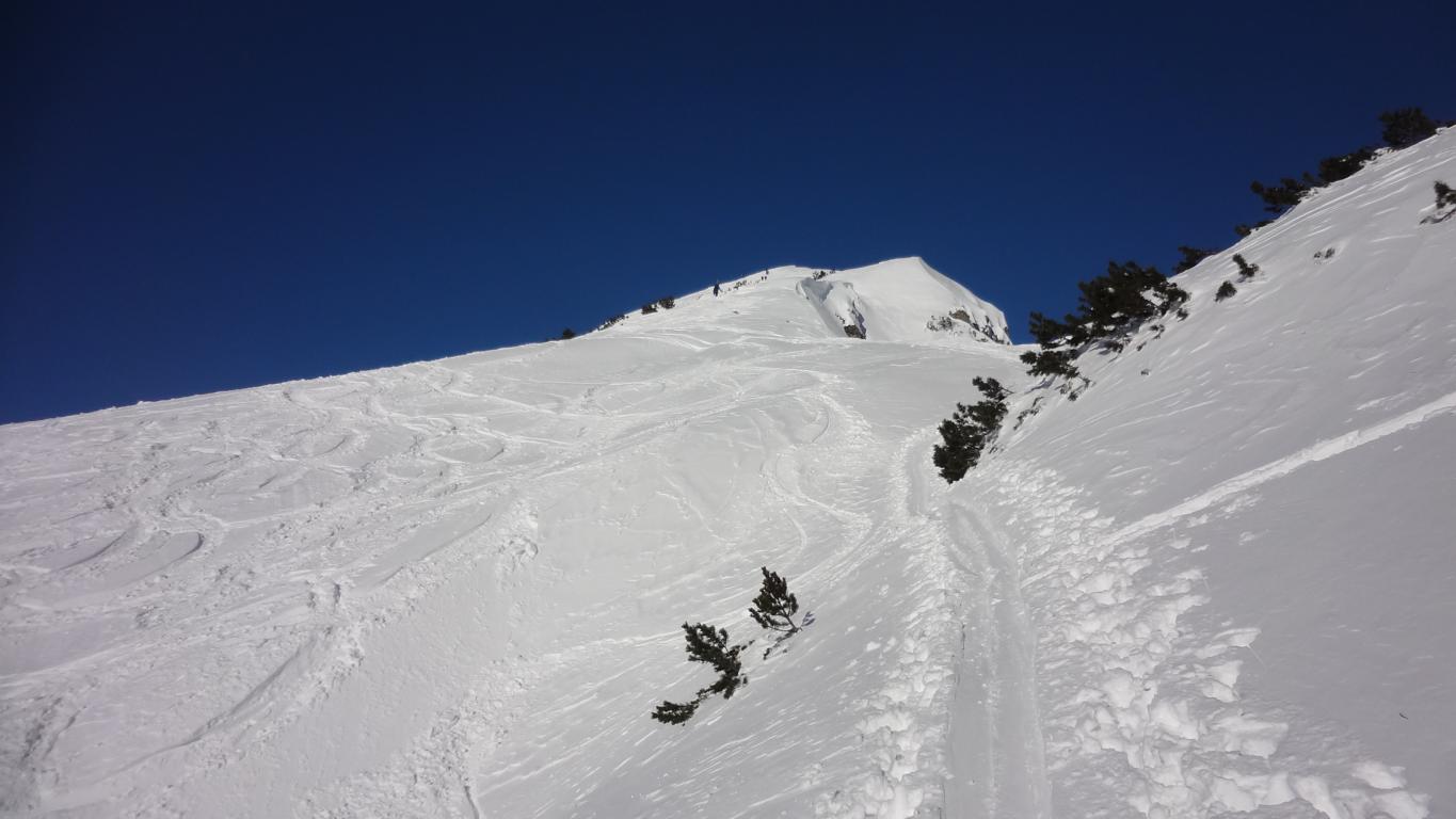 Perfekte Schneeverhältnisse ca. 20 – 30 cm Pulverschnee. Leider war heute schon fast alles verspurt. Trotzdem fand ich bei der Abfahrt doch noch ein paar Stellen abseits des Aufstieges wo ich meine Spuren im Traum-Pulver ziehen konnte.