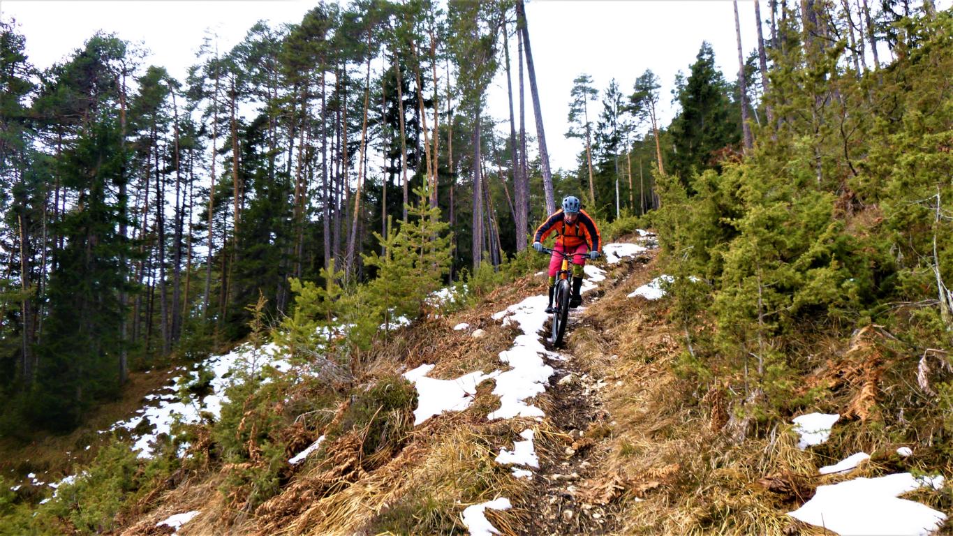 Vom Straßbergweg über den flowigen S1/S2 Trail auf festem Untergrund mit einigen S2/S3-Spitzkehren, kleineren Wurzel- und Felsstufen hinunter zum Griesbach.