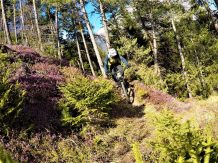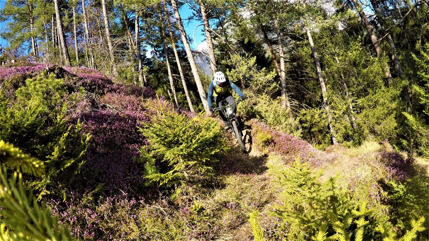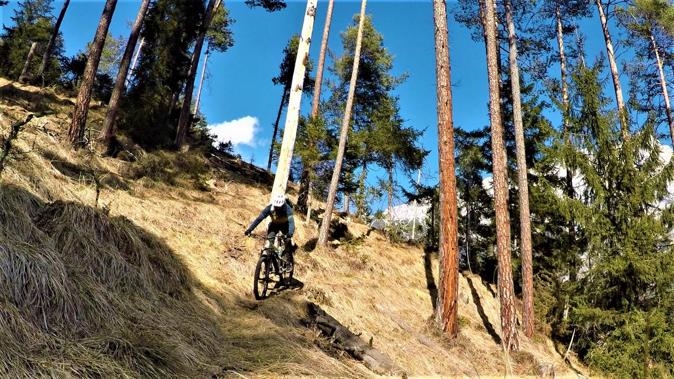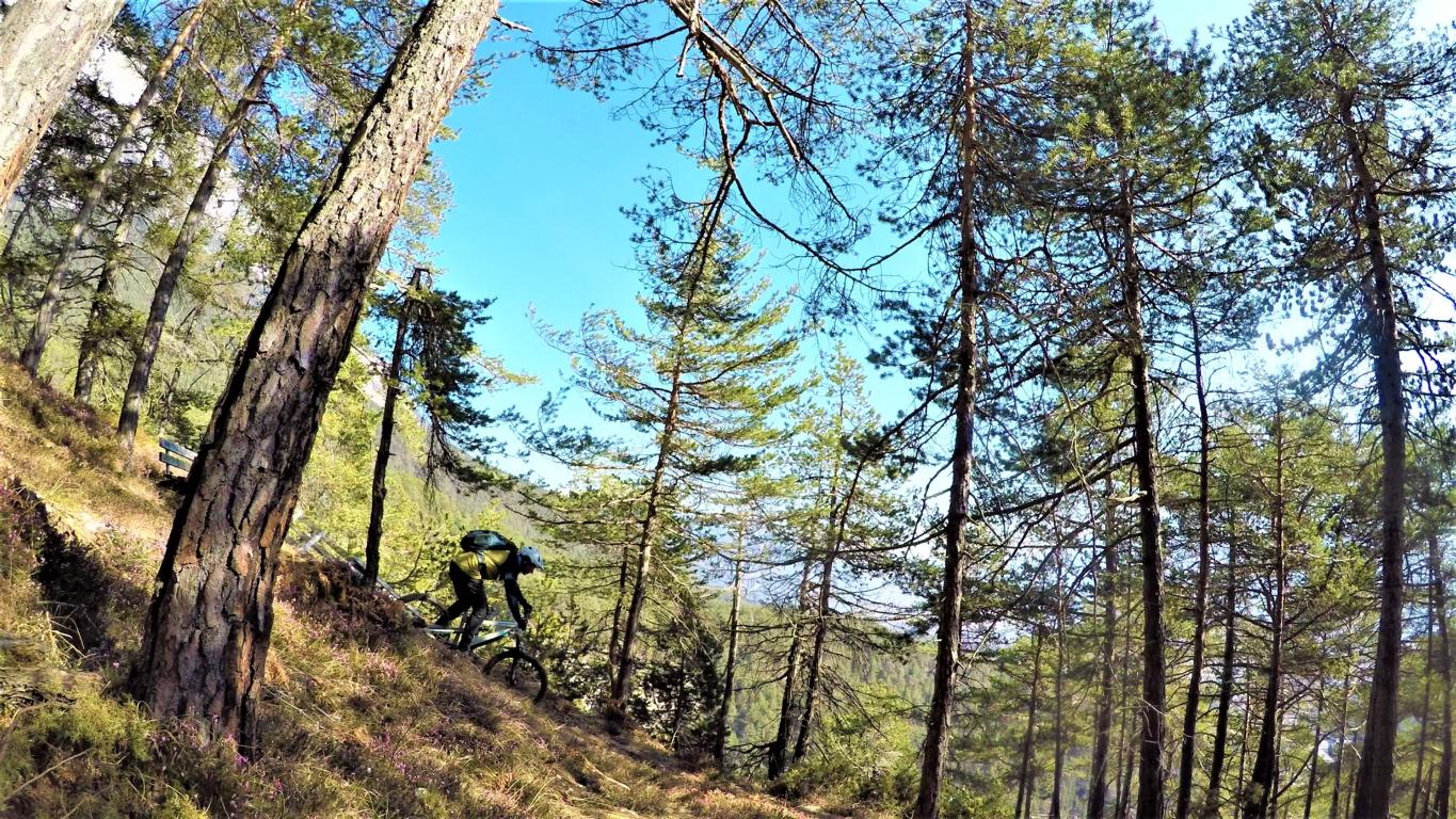 Vom Straßbergweg über den flowigen S1/S2 Trail auf festem Untergrund mit einigen S2/S3-Spitzkehren, kleineren Wurzel- und Felsstufen hinunter zum Griesbach. Die Varianten beginnen im letzten Drittel der Abfahrt und führt rechts vom Klammweg mit drei kurzen Gegenanstiegen hinunter über den unteren Zimmerbergtrail zurück nach Telfs.